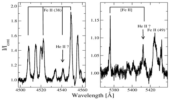 The He ii 4541.59 Å line is located very close to the Fe ii (Mult. 38) 4541.52 Å line and, in principle, can be considered an identification of the line shown in the left panel of Figure 3. However, the other Fe ii (Mult. 38) lines are obviously present in this spectral part and have similar profiles that makes it more appropriate to identify this line with that of Fe ii (Mult. 38). At the same time, the He ii 5411.52 Å line is shifted by 60 km from the position of the [Fe ii] (Mult. 17F) 5412.64 Å line, which has a similar profile and RV with that of the other [Fe ii] line shown in the right panel of Figure 3. Moreover, both mentioned He ii lines belong to the same Multiplet 2 and should not have such different profiles as those seen in the panels of Figure 3. As a consequence of the absence of He ii lines, the T of the underlying star being higher than K can be ruled out, see ref. [36].