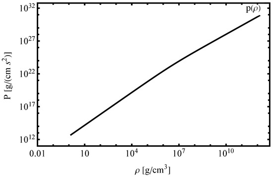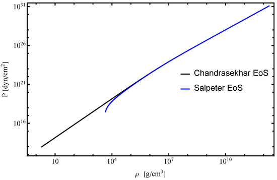 To illustrate the effect of these corrections, we present a log–log comparison of the pressure–density relation for the Chandrasekhar and Salpeter EoS in Figure 1. The Salpeter model includes electrostatic and Thomas–Fermi corrections, following the analytical expressions derived in [38]. As shown in the Figure 1, at lower and intermediate densities (–), the pressure predicted by the Salpeter EoS is noticeably lower due to additional microphysical effects. At higher densities, the two curves converge as relativistic degeneracy dominates. This comparison shows that Salpeter corrections become relevant in the lower-density regime of white dwarfs and confirms the applicability of our numerical approach to both models.