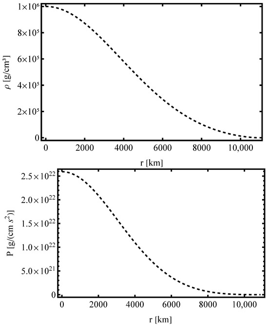 The normalization condition establishes a direct connection between physical quantities, such as central density and pressure , and their dimensionless counterparts. Since the governing equations are expressed in parametric form, they can be readily rewritten in dimensionless terms by appropriately rescaling variables. By substituting Equation (6) into Equation (13) and Equation (7) into Equation (14), the density and pressure expressions take the following form [63]: