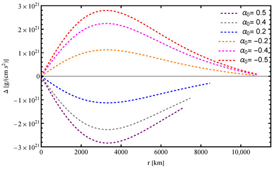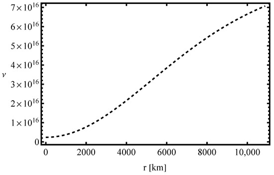 Furthermore, the numerical solution for the metric function, shown in Figure 4, exhibits a smooth and continuous behavior throughout the interior of the object. The absence of singularities ensures the physical consistency of the solution, confirming the regularity of spacetime within the white dwarf.