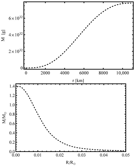 Figure 5 presents two complementary perspectives on the mass distribution and structural properties of the white dwarf. The left panel shows the enclosed mass as a function of the radial coordinate r (in km). The curve increases monotonically, reflecting the accumulation of mass from the center to the surface of the white dwarf. The mass asymptotically approaches its final value near the stellar radius 10,884.5 km, indicating the expected compact structure, with most of the mass concentrated in the inner regions. The right panel displays the mass–radius relation in normalized solar units, where both mass and radius are expressed as fractions of the solar mass and solar radius , respectively. These plots confirm that the numerical solutions reproduce the expected behavior of white dwarfs: compact, stable configurations whose maximum mass does not exceed the Chandrasekhar limit.