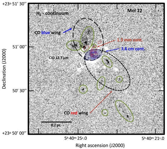 Figure 1. An image of the continuum-subtracted molecular hydrogen (H2) line at 2.12 μ m in the 1.5 × 1.5 square arcminute area surrounding Mol 12. The blue contours represent the compact HII region’s 3.6 cm continuum emission [4], with Mol 12A at its centre. The 1.3 mm thermal dust emission [4] is shown with red contours. The black long- and short-dashed ellipses delineate the main contours of the blue- and red-shifted high-velocity wings of the bipolar 12CO emission lobes [5]. The green ellipses mark the positions of the shocked H2 emission knots [1] surrounding Mol 12. Adapted from [1].