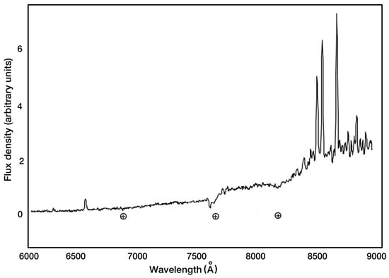 Figure 2. TNG/DOLORES reduced low-resolution spectrum of Mol 12A in the range of 5900 to 9100 Å. The brightest emission lines, increasing in wavelength, are those of [OI], H α , Ca II, and Paschen 12. Note that the spectrum shown is not absolute flux-calibrated or extinction-corrected.