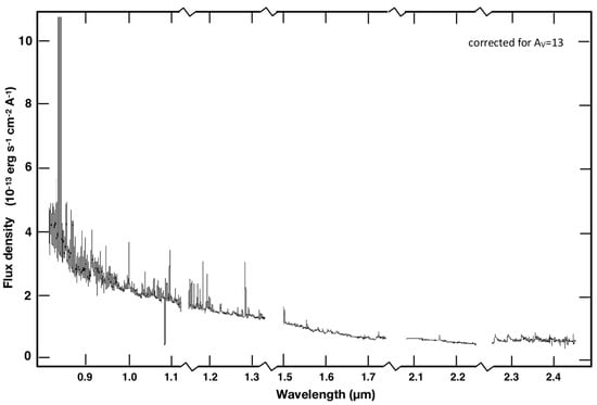 Figure 3. The FIRE medium-resolution spectrum of Mol 12, corrected for a standard extinction of A V = 13 , as estimated for the time of observation from the light curves. It covers the range from 0.85 to 2.30 μ m in the near-IR atmospheric windows. It shows the absolute flux−calibrated Echelle orders of the spectrum.