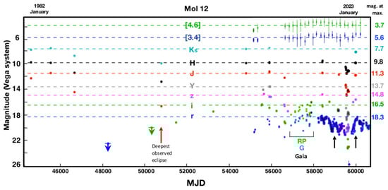 Figure 5. Multi-wavelength light curves of Mol 12A covering the period from MJD 44580 to MJD 60500 (1980 December to 2024 April) constructed from the available photometric measurements of Mol 12A, as described in the text. These include the photometric bands r, i, z, y, J, H, K s , WISE [3.4], [4.6], and Gaia G and GRP, each plotted with a different colour as labelled. The arrows indicate the epoch when the spectra were obtained. The Gaia photometric bands (plotted with smaller dots) are marked. The dashed lines mark the out-of-eclipse brightness maxima of Mol 12A for each filter. The figures on the extreme right show the calculated out-of-eclipse (OoE) magnitudes. Adapted from Tapia et al. [8].
