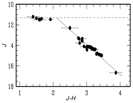 Figure 6. J versus J H diagram of Mol 12A at different epochs. The dashed line marks the max J magnitude at the maximum light intensity and the continuous line, with the slope Δ J / E ( J H ) = 2.9 , provides a comparison to the value of 2.1 that characterizes the standard interstellar reddening law.