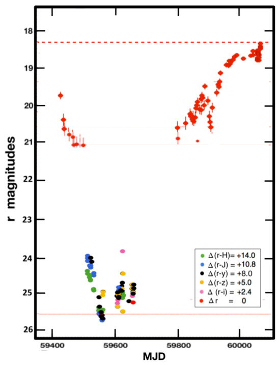 Figure 7. A close-up view of the r band light curve of Mol 12A (red points) covering the period from MJD 59420 to MJD 60100, from the ZTF survey. The points drawn in different colours correspond to the RATIR i , z , y , J , and H shifted magnitudes. Shifting each band consisted of adding an amount of Δ ( r m ) , as shown in the legend, such that the minimum plateau reached during the eclipse was at the same level as the single r measurement. The horizontal broken line indicates the maximum r magnitude, and the thin continuous lines illustrate two characteristic minimum levels. Adapted from Tapia et al. [8].