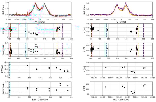 In recent months, the observational campaign has been expanded to include polarimetric monitoring. The most notable case so far is the Be star 12 Vul, shown in Figure 3. The left and top panels display variations in H consistent with those reported by [53]. These changes are accompanied by significant changes in both the polarization level and angle (right panels). The four bottom panels highlight the short-term variability of the observables, focusing on the periods with the largest observed changes in line emission (right) and polarization (left). Note in particular the large polarization variability—both in level and angle—seen in timescales of hours. This is reminiscent of the variations reported by [58] on Achernar. Together, these findings provide strong evidence that 12 Vul is undergoing active mass loss, in agreement with the spectroscopic indicators, and that this mass loss presents a complex geometry.