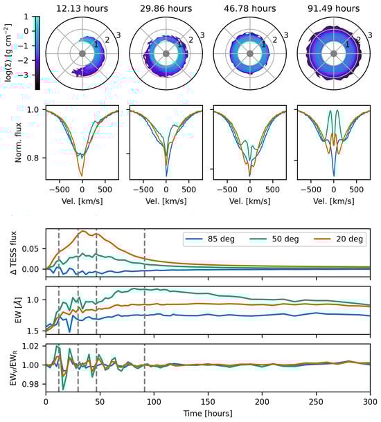 SPH and HDUST models of a localized mass ejection in a Be star. First row: snapshots of the temporal evolution of the surface density in one of the SPH simulations of [61]. Mass is ejected from an injection volume that rotates 5% faster than the angular orbital velocity in the equator of the star. Individual particles have an added ballistic velocity of 20 km s−1 with a random orientation. The injection volume covers an azimuthal range of 0.2 radians around the stellar equator. Second row: H line profiles for each snapshot, with the line color indicating the observer inclination angle (see legend in the third row). Third to fifth rows: the temporal evolution of the photometry, H EW, and (Equation (1)), respectively. The times of each snapshots shown in the first and second rows are marked by dashed gray lines.