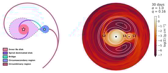 On the (left), a schematic representation of the disk, with the Be star centered and the stripped secondary on the right. On the (right), density maps for a model showing the Roche equipotential contours and the Lagrangian points. The Be star is the centered black dot, the secondary is the black star on the right. Figure adapted from [63], ©ESO, distributed under the terms of the Creative Commons Attribution License (CC BY 4.0).