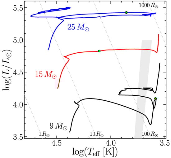 An HRD showing typical evolutionary pathways for three different initial masses at solar metallicity, and with an initial rotation (models from [10]). The green dots mark the location at the start of He burning. The 9 model (black) shows a quick crossing of the HRD at the end of the MS, and a blue loop during the RSG phase. The 15 model (red) shows a slow crossing to the RSG branch. The 25 model (blue) undergoes strong mass loss during the RSG phase, making the star evolve bluewards at some point during the RSG phase, and end its life in the blue region of the HRD. The grey shaded area indicates the Cepheid instability strips, inside which a star is expected to have large radial oscillations (determination from [11]). Lines of iso-R are displayed.
