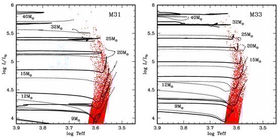 The HRD of observed RSGs ([36], red dots) in M31 (left) and M33 (right). Stellar evolution tracks are overplotted: GENEC models (solid lines) from [10] for M31 (), and from [37] for M33 (); MIST models (dotted lines) from [38] with [Fe/H] = 0 for M31, and [Fe/H] = −0.5 for M33. Adapted from Figure 8 of [36].