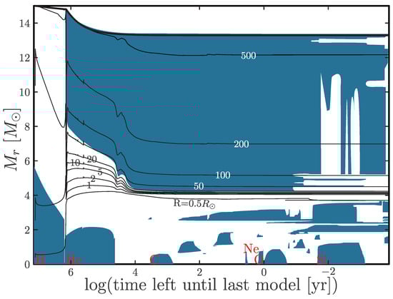 A Kippenhahn diagram of a 15 model at solar metallicity (model from [42]). The convective zones are the blue shaded regions. Lines of iso-R are displayed. The central burning phases are indicated in red. The thick black line shows the total mass evolution of the star.