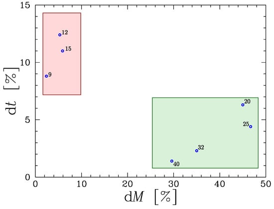 The duration of the RSG phase (in fractions of the total lifetime) as a function of the mass lost in this phase (in fractions of the total initial mass). Data from the non-rotating models of [10]. The region of low dM-large dt (occupied by the lowest-mass models) is shaded in red, while the region of large dM-low dt (occupied by the highest-mass models) is shaded in green.
