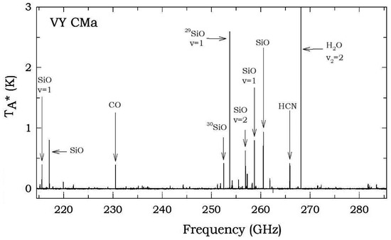 This viewpoint changed dramatically over the past decade with new targeted spectroscopic studies of RSGs. Perhaps the most notable is the sensitive spectral-line survey carried out for VY CMa in 2010 [8,25]—the first such survey focused on the chemical characterization of an O-rich circumstellar shell at millimeter wavelengths. Conducted with the Submillimeter Telescope (SMT) of the Arizona Radio Observatory (ARO) with new 1 mm sideband-separating mixers developed for ALMA, this survey showed that the envelope of VY CMa has a complex chemical environment. Over the frequency range 214.5–285.5 GHz of the survey, 128 emission features were detected, arising from 18 different molecules (see Figure 2), with the overall spectrum dominated by and SiS. In a comparative survey of IRC+10216, 720 lines were observed, assigned to 32 different species in contrast. The observations, however, were conducted with a 30 arcsec beam, favoring IRC+10216 over VY CMa at their respective distances (0.15 kpc vs. 1.2 kpc). Nonetheless, the survey of VY CMa resulted in the detection of several new interstellar oxide molecules, including PO [26], AlO [27], and AlOH [28]. The study also identified the presence of uncommon species such as NaCl and PN in this object. The line profiles observed varied among the detected molecules as well; some spectra had multiple velocity components that appeared to be associated with the highly-directional mass loss events traced by arcs and clumps in HST images [29]. Detections of other new species, such as TiO, [30], and VO followed [31]. Note that oxides like TiO and VO were reported previously in the optical spectra of stellar photospheres [32], but these are the first recognized circumstellar detections.