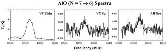 Circumstellar spectra of the transition of AlO measured towards the envelopes of three RSG stars, using ALMA: VY CMa, VX Sgr, and AH Sco. The broad profiles are in part due to the fine and hyperfine structure in AlO. The line is strongest in VY CMa [36,50].