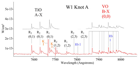 HSTspectra of the circumstellar gas about 50 from the star near 7800 Å (W1 Knot A), showing the A-X and B-X electronic transitions of TiO (left) and VO (right), identifying VO as a new interstellar molecule [31]. The numbers in parentheses are the respective vibrational quantum numbers of the respective states, and , , etc., are the spin-orbit ladder components. Simulated spectra are shown above the data. Ki atomic lines in the TiO data have been truncated.
