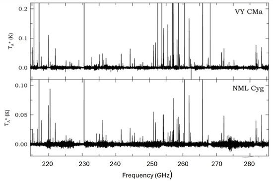 Composite spectrum of the ARO SMT 1 mm survey of VY CMa (upper panel; also Figure 1), and an identical survey spectrum of NML Cyg (lower panel), covering 215–285 GHz. The spectra look almost identical [8,38,39].