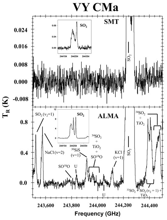 Comparison of spectra of VY CMa from the SMT 1 mm survey (upper) and from ALMA (lower), near 244 GHz [8,55]. The truncated line is , shown in the insets. Note the sharp blue and red-shifted components of .
