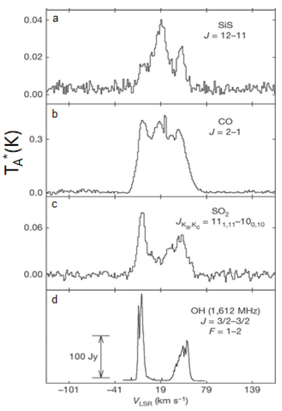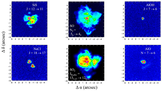 - Danilovich, T.; Richards, A.M.S.; Decin, L.; Van de Sande, M.; Gottlieb, C.A. An ALMA view of SO and SO2 around oxygen-rich AGB stars. Mon. Not. R. Astron. Soc. 2020, 494, 1323–1347. [Google Scholar] [CrossRef]