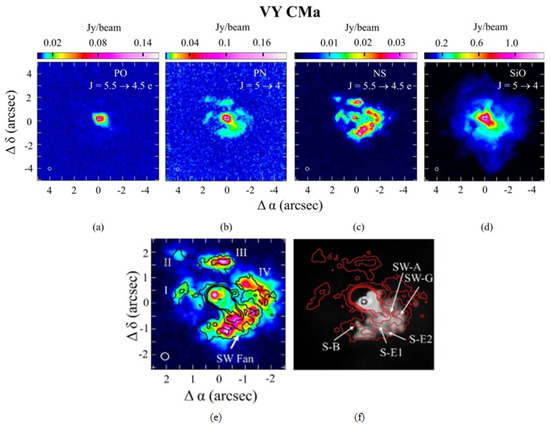 In Figure 9, the distributions of the two phosphorus-bearing molecules are shown: PO and PN (a, b). The extent of oxide PO closely resembles that of AlO and is centered on the star, extending out to ∼60 . PN has a far more intricate structure, with the continuous emission SW of the star in a fan-like geometry, the “SW Fan” as mentioned (see Figure 9e). The fan encompasses part of the SW Clump cluster. PN appears to trace the cluster knots S-B, SW-A, SW-G, S-E1/E2 (see Figure 9f) [37,52]. PN also exhibits four other small structures to the north, east and west of the star (“Cloudlets” I, II, III, IV; see e). These features are even more conspicuous in NS, as the figure shows (see c, e). The data suggest a strong connection between the N-bearing species PN and NS, which will be discussed in Section 4.4. SiO is also observed in the SW Fan and in some of the Cloudlets but has emission extending over from the stellar position, faintly tracing the Arc 2 and the NW Arc, among other features (see Figure 1). SiO is thought to be a tracer of shocks, and may highlight shocked regions [60].