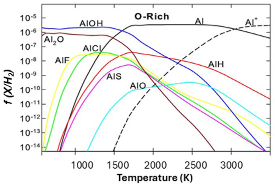 - Agundez, M.; Martinez, J.I.; de Andres, P.L.; Cernicharo, J.; Martin-Gago, J.A. Chemical equilibrium in AGB atmospheres: Successes, failures, and prospects for small molecules, clusters, and condensates. Astron. Astrophys. 2020, 637, A59. [Google Scholar] [CrossRef]