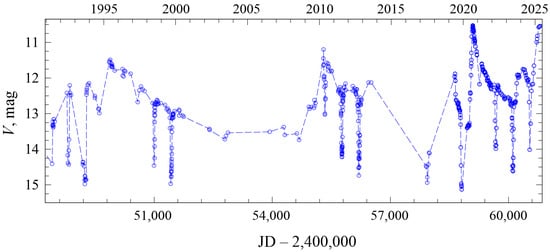 Figure 1 shows the V-band light curve of V1413 Aql, based on our new observations (Table 1) and previously published data [14,19,20,21]. During this period, we recorded four outbursts, with brightness maxima occurring in 1995, 2010, 2020, and 2025. No intermediate outbursts were detected between 1995 and 2010—a gap confirmed by photometric data from the AAVSO database.