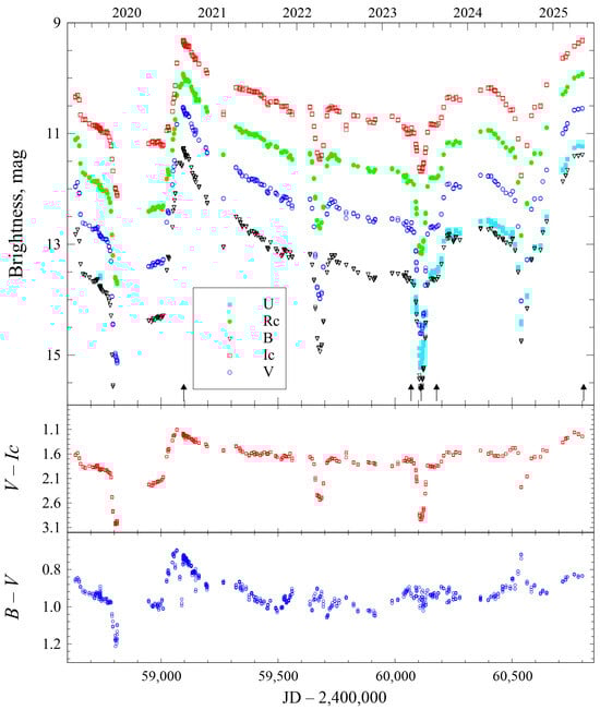 The and -band light and , color curves of V1413 Aql (2019–2025). The arrows indicate the epochs of low-resolution spectra discussed in the paper.