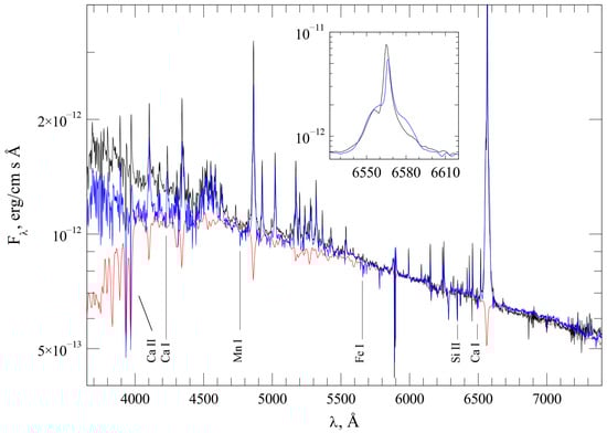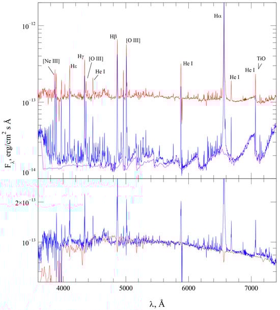 The spectrum obtained during the eclipse minimum at phase clearly shows the contribution of the cool component in the red part of the spectrum and nebular emission in the blue region. However, spectral modeling reveals that an additional source of continuum radiation is required to achieve a good match with the observed spectrum. In Figure 5, the blue line represents the observed spectrum during eclipse, while the magenta line shows its model approximation. The continuum emission of the model, which includes three components—an M6 III-type giant, a nebula with =10,000–12,000 K, and an additional blackbody-like component with = 8000–10,000 K—differs from the observed SED corrected for interstellar extinction by no more than 20%. The luminosity of the cool component is , with a radius . The blackbody component has a luminosity of . It is worth noting that during the subsequent eclipse in 2024, discussed in detail by [30], a similar blackbody component was also detected but with a lower effective temperature of K.
