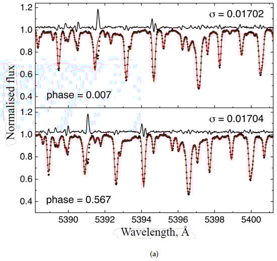 - Ryabchikova, T.; Zvyagintsev, S.; Tkachenko, A.; Tsymbal, V.; Pakhomov, Y.; Semenko, E. Fundamental parameters and abundance analysis of the components in the SB2 system HD 60803. Mon. Not. R. Astron. Soc. 2022, 509, 202. [Google Scholar] [CrossRef]