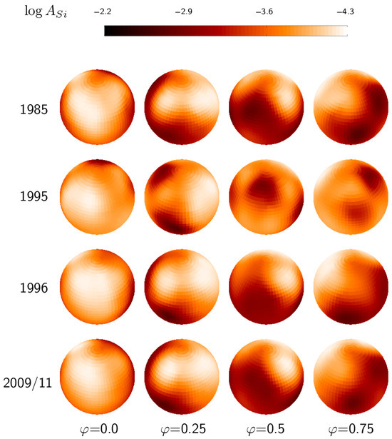 Silicon surface maps of CU Vir at four observational seasons within the 1985–2011 time span are presented in Figure 1. The distribution of silicon over the stellar surface is strongly inhomogeneous. At phase , an extended region with near-solar Si abundance dominates. The areas of enhanced Si abundance are grouped in three patches. A highly contrast spot with an excess [Si/H] = dex is located south of the equator and is visible on the limb at phase . At phase , a butterfly-like structure consisting of two Si spots with abundance [Si/H] ≈ +1.5 dex is situated on the visible disc of the star, symmetrically relative to the equator. The difference in abundance scale among the 1985, 1996, and 2009/11 maps, which were inversed using Si ii 6347 Å line, does not exceed 0.1 dex and is likely due to differences in data processing, primarily uncertainties in the continuum level of the original observational data. The Doppler map derived from the 1995 observations using the Si ii 4128/4130 Å doublet shows a larger abundance contrast; its maximum value exceeds those obtained from the Si ii 6347 Å line by dex. Uncertainties in continuum placement (the silicon line is located in the wing of ) and NLTE effects are possible reasons for this discrepancy. Nevertheless, the silicon spot pattern remains consistent across different seasons and aligns with previous DI results [2,6].