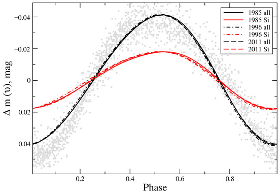 Synthetic light curves of CU Vir calculated using the surface Si maps for 1985, 1996, and 2009/11. Explanations of the line types are provided in the legend at the upper right. The light curves resulting from the inhomogeneous distribution of silicon alone are shown separately by red curves. Light curves calculated while also taking into account the He, Fe, and Cr are depicted by black lines. The dots represent observations in the Strömgren v band according to Pyper et al. [17]. The vertical scale is graded in magnitudes relative to the average brightness.