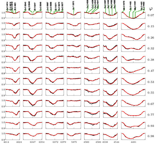 As input parameters for the DI of CU Vir, we adopted the stellar atmosphere parameters from Kochukhov et al. [2]: an effective temperature = 12,750 K, and a surface gravity = 4.3. The phase-averaged abundances of He, Si, Fe, Cr, and Mg were adopted from Kochukhov et al. [2], Kuschnig et al. [6]. Using these parameters and abundances, the LTE model of the CU Vir atmosphere was computed with the LLmodel code [37], accounting for opacity distribution due to the specific chemical composition. This model was subsequently employed in the Doppler inversion. The atomic data for the lines used in DI were critically selected from the VALD3 database [38] and are listed in Table A1. The wavelengths and oscillator strengths of the transitions were verified and corrected, where necessary, using the high-resolution spectrum of the slowly rotating normal star Cet as a benchmark.
