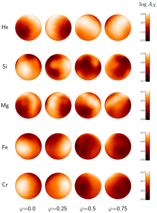 Comparison of our DI results with previous studies allows us to validate abundance maps of CU Vir obtained using slightly different approaches and updated atomic data. In terms of spot geometry, the results show very good agreement with earlier imaging [2,5,6]. The abundance scales may differ to some extent depending on the line lists and the atomic data employed. A comparison of the maps (Figure 4) reveals very similar distribution patterns for silicon, iron, and chromium featuring a double spot near the negative magnetic pole (as inferred from the magnetic curve in Figure 6 by Kochukhov et al. [2]) and an extended region of decreased abundance near the positive pole. On the contrary, helium and magnesium in this latter region exhibit large overabundant spots, while areas of elemental deficiency form rings tilted relative to the equator of rotation.