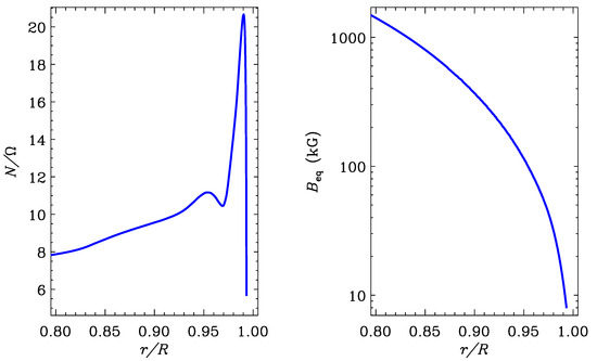 Given the similarity of the 56 Ari and CU Vir parameters, we expectedly obtained quite similar results. Figure 5 shows the radial profiles of the ratio and equipartition field strength . Since the largest growth rate of the Tayler instability corresponds to [52], we took the stellar parameters at , which is approximately one radial wavelength below the surface. The computed growth and drift rates are shown in Figure 6 as a function of the background field strength.