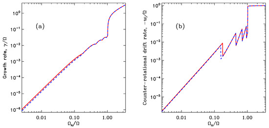 The growth rates (panel (a)) and drift rates (panel (b)) of the instability in the reference frame rotating with the star. The full and dashed lines correspond to modes symmetric and antisymmetric about the equator, respectively.