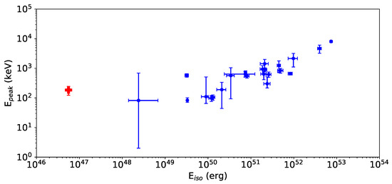Peak energy versus isotropic equivalent energy for GRB 170817A (red cross) and a selection of short GRBs from [138] (blue filled circles.)