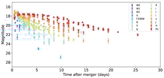 The optical counterpart of GW170817/GRB 170817A, SS17a/AT 2017gfo, was detected in the elliptical galaxy NGC 4993 10.87 h after the merging by the One Meter Two Hemisphere collaboration [65] and confirmed in the following hours by DLT40 [66], VISTA [76], MASTER [68], DECam [77], and Las Cumbres [78]. No optical transient was detected in the archival images secured before the merger [66]. The extensive ultraviolet, optical, and infrared photometric observations have been collected and reviewed by [155], see also individual papers [65,66,67,68,76,77,78,79,84,156,157,158,159,160,161,162,163,164,165,166,167,168,169]. The light curve of AT 2017gfo in different photometric bands covering the first month after the merger, built using the data reported by [155], is reported in Figure 3. The UV and bluer bands showed a faster decline compared to the redder ones [75,79,155,161]. The infrared band peaked at about 3.5 days [65,67,77,157,160,164,166].