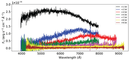 Spectra of AT 2017gfo in the first days after the merger; data from [176], available at https://kilonova.org/data (accessed on 1 January 2025).