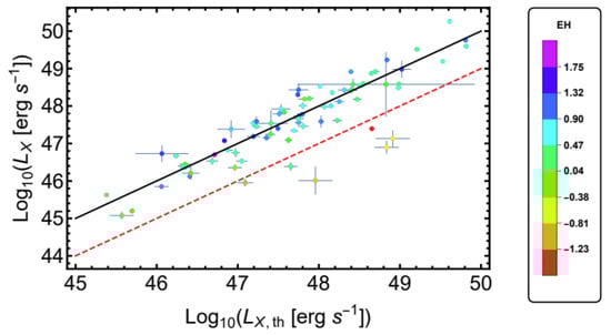 Observed vs. predicted Dainotti relation values, with the EH parameter marked by color; the dashed red line marks the 1 dex offset from the equality line. Image credits: [252].