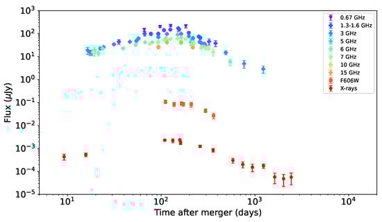 The afterglow light curve of GW170817 in different bands (radio: 0.67, 1.3–1.6, 3, 5, 6, 7, 10, 15 Ghz; optical data: HST F606W band; X-rays: Chandra, XMM-Newton) covering from +0.5 d to +2440 d after the merger; upper limits not reported. Data credits: [277,278,279,281,282,283], updated data available at https://github.com/kmooley/GW170817/tree/main (accessed on 1 January 2025).