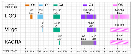 The nominal range detection of BNS systems by the end of the O4 run is above 150–160 Mpc for LIGO, 50–80 Mpc for Virgo, and 10 Mpc for KAGRA is reported in Figure 7, with a large improvement expected in the O5 run (https://observing.docs.ligo.org/plan/, accessed on 1 February 2025).