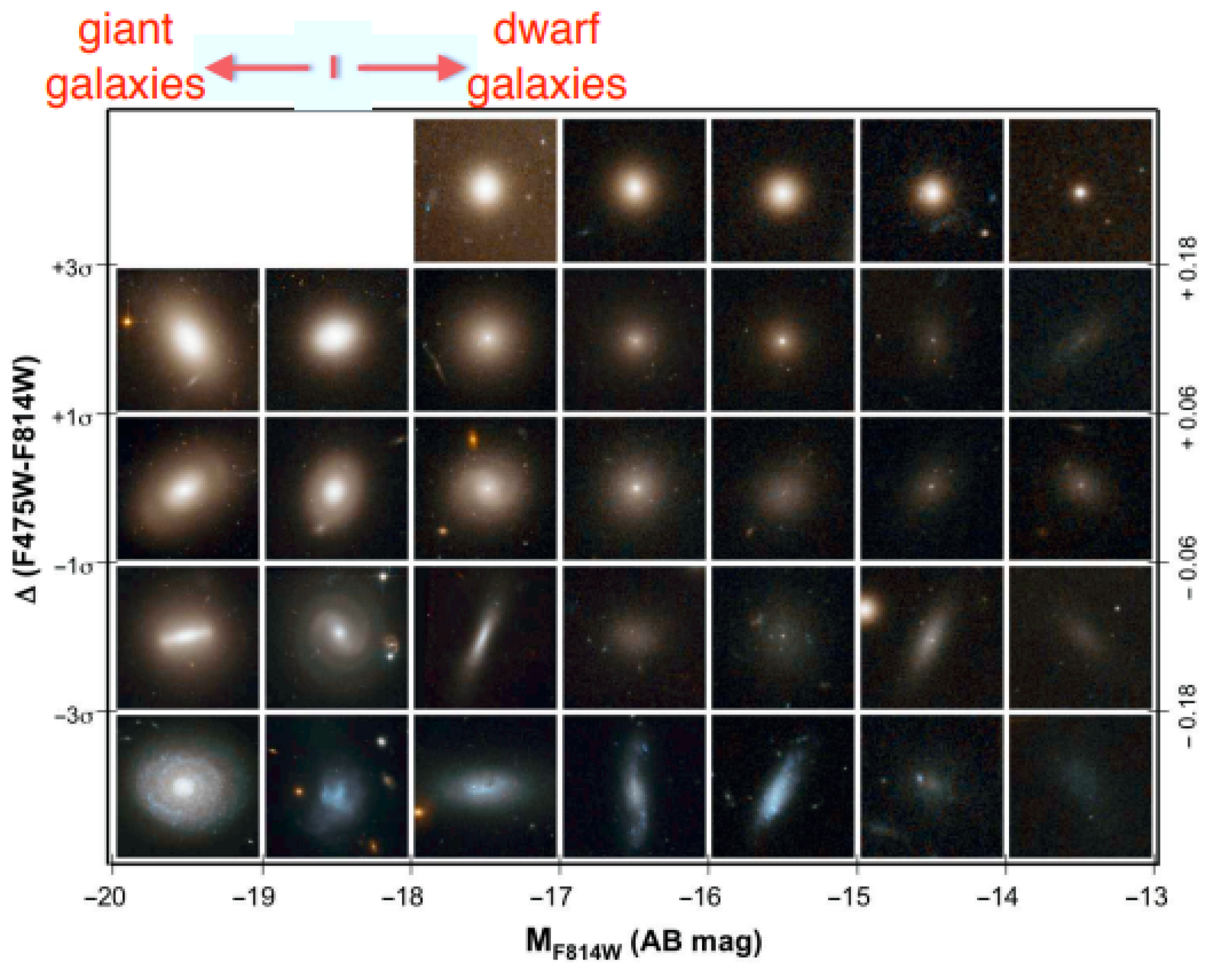 This CMD replaces data points with actual image cutouts from high-resolution Hubble Space Telescope observations, showcasing typical examples across various regions of color space. The middle row of the CMD represents the “red sequence” of galaxies. Detecting and analyzing dwarf galaxies is difficult because they get dimmer as they get fainter, making their surface brightness less intense [