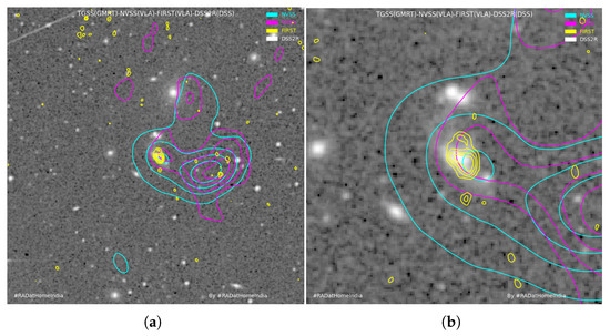- Condon, J.J.; Cotton, W.D.; Greisen, E.W.; Yin, Q.F.; Perley, R.A.; Taylor, G.B.; Broderick, J.J. The NRAO VLA Sky Survey. Astron. J. 1998, 115, 1693–1716. [Google Scholar] [CrossRef]