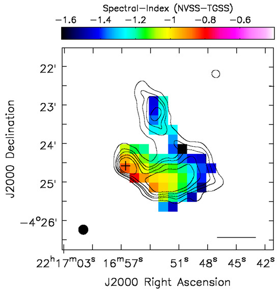 - de Gasperin, F.; Intema, H.T.; Frail, D.A. A radio spectral index map and catalogue at 147–1400 MHz covering 80 per cent of the sky. Mon. Not. R. Astron. Soc. 2018, 474, 5008–5022. [Google Scholar] [CrossRef]