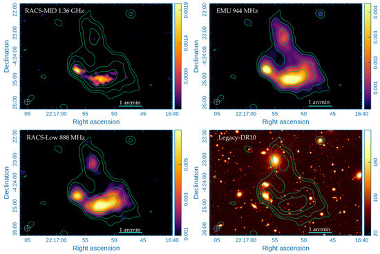 - Hopkins, A.M.; Kapinska, A.; Marvil, J.; Vernstrom, T.; Collier, J.D.; Norris, R.P.; Gordon, Y.A.; Duchesne, S.W.; Rudnick, L.; Gupta, N.; et al. The Evolutionary Map of the Universe: A new radio atlas for the southern hemisphere sky. Publ. Astron. Soc. Aust. 2025, 42, e071. [Google Scholar] [CrossRef]