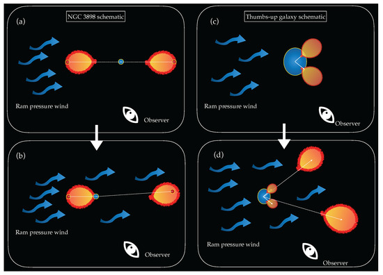 - Abadi, M.G.; Moore, B.; Bower, R.G. Ram pressure stripping of spiral galaxies in clusters. Mon. Not. R. Astron. Soc. 1999, 308, 947–954. [Google Scholar] [CrossRef]