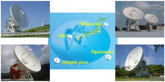 In the era of the reorganization of the Mizusawa Latitude Observatory to NAOJ Mizusawa, VERA’s design was also reorganized to have more focus on astronomical observation rather than geodesy, and for this reason, the array was re-designed to have antennas at four stations, resulting in the current array with four locations as shown in Figure 1. In the late 1990s, further consideration was given to the antenna design to make the telescope as much as sensitive while keeping the boundary of a budgetary limit, and the final design was completed with an idea of equipping a dual-beam observing system onto each 20 m-diameter antenna [2,3,4,5], instead of placing two small antennas at each site. In 2000, the initial budget was allocated and construction began.