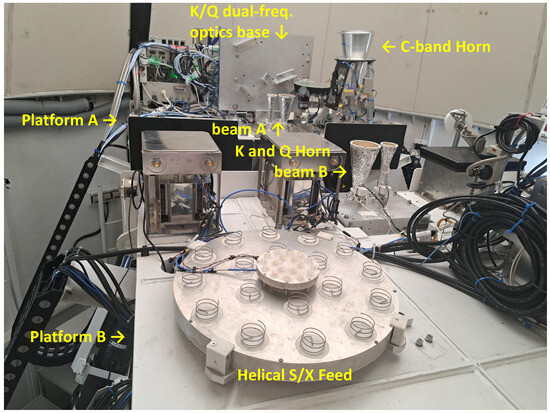 Internal view of receiver cabin at VERA Mizusawa station. Two platforms are seen (A at far side and B at near side), on which several receivers are installed. Note that the two pairs of K- and Q-band horns are installed onto both platforms, enabling us to conduct dual-beam observations at these two bands.