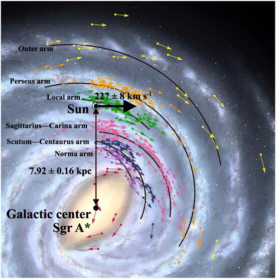 Galactic maser astrometry results overlaid on an artistic image of the face-on view of the Milky Way Galaxy. Distributions of the maser sources measured with VLBI are plotted with the observed proper motion vectors (allows), which are the sum of Galactic rotation and (rather smaller) peculiar motions. The different colors indicate the association of different spiral arms defined by the BeSSeL project [14], with black solid curves showing the spiral arm locations. The Galactic center distance, , and rotation velocity, , determined by the VERA project [10] are also written in the figure.